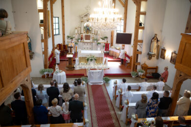 Dlatego fotografujemy we dwoje: ja i mój mąż. Dzięki temu dyskretnie obejmujemy ceremonię z dwóch perspektyw, bez biegania po prezbiterium i bez wchodzenia w kadr. To nasza przewaga – nikt w mieście nie pracuje podczas komunii w takim duecie.